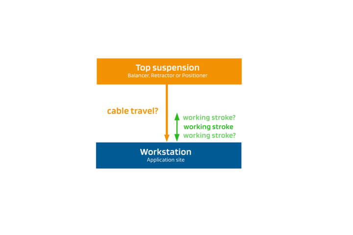 What cable extension is needed to ensure that the application safely reaches the entire working area? Both the upper suspension point and the required working stroke must be taken into account to provide the operator with sufficient freedom of movement for ergonomic working conditions.