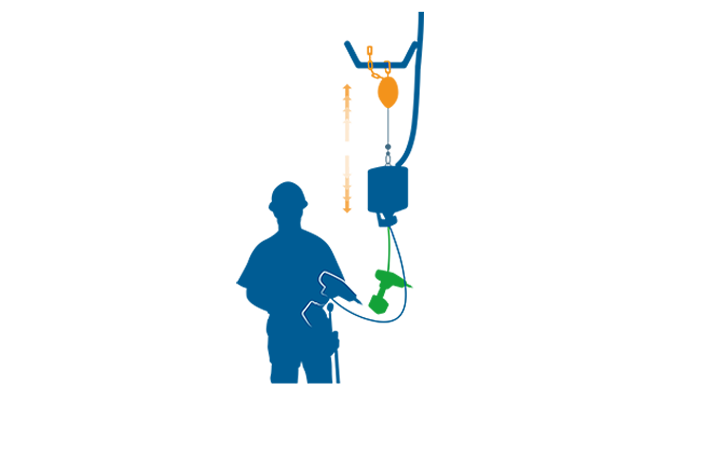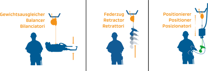 Balancers are used to compensate the weight of tools or loads, enabling nearly weightless and highly precise movement within the working area. Attached tools can be guided in a controlled manner and held securely in any defined position.